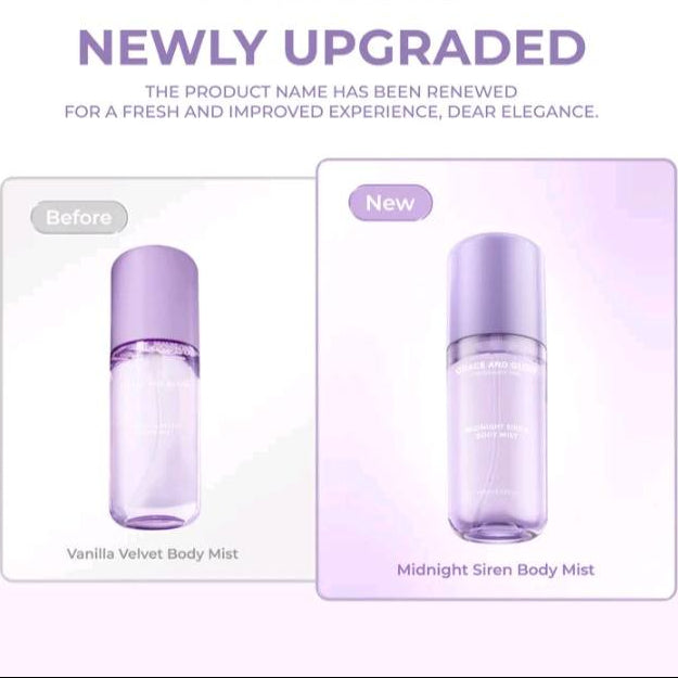 Grace and Glow Vanilla Velvet Body Mist (Now Renamed to Midnight Siren) provides a light, refreshing fragrance that delicately envelops the skin, leaving it subtly scented throughout the day. Enriched with expensive perfume for an impressive experience on daily activity. This body mist is inspired by luxurious perfume scent. Vanilla Velvet Body Mist is included in the Body Mist category which will last approximately 2-3 hours. Vanilla Velvet is a body mist that has a sweet but elegant fragrance. Top notes are Pear, Pink Pepper and Orange Blossom; middle notes are Jasmine, Licorice; base notes are Vanilla, Patchouli.