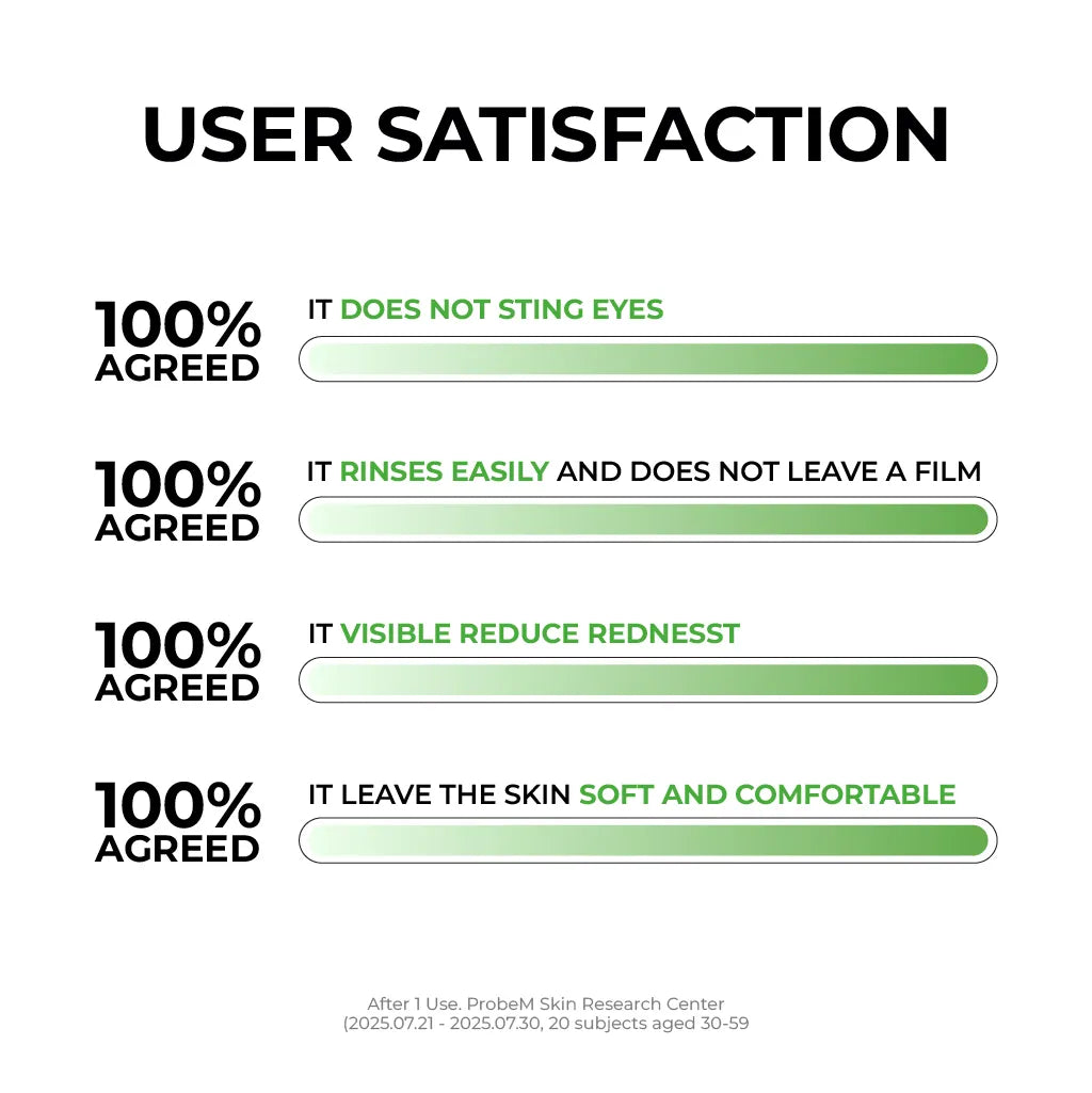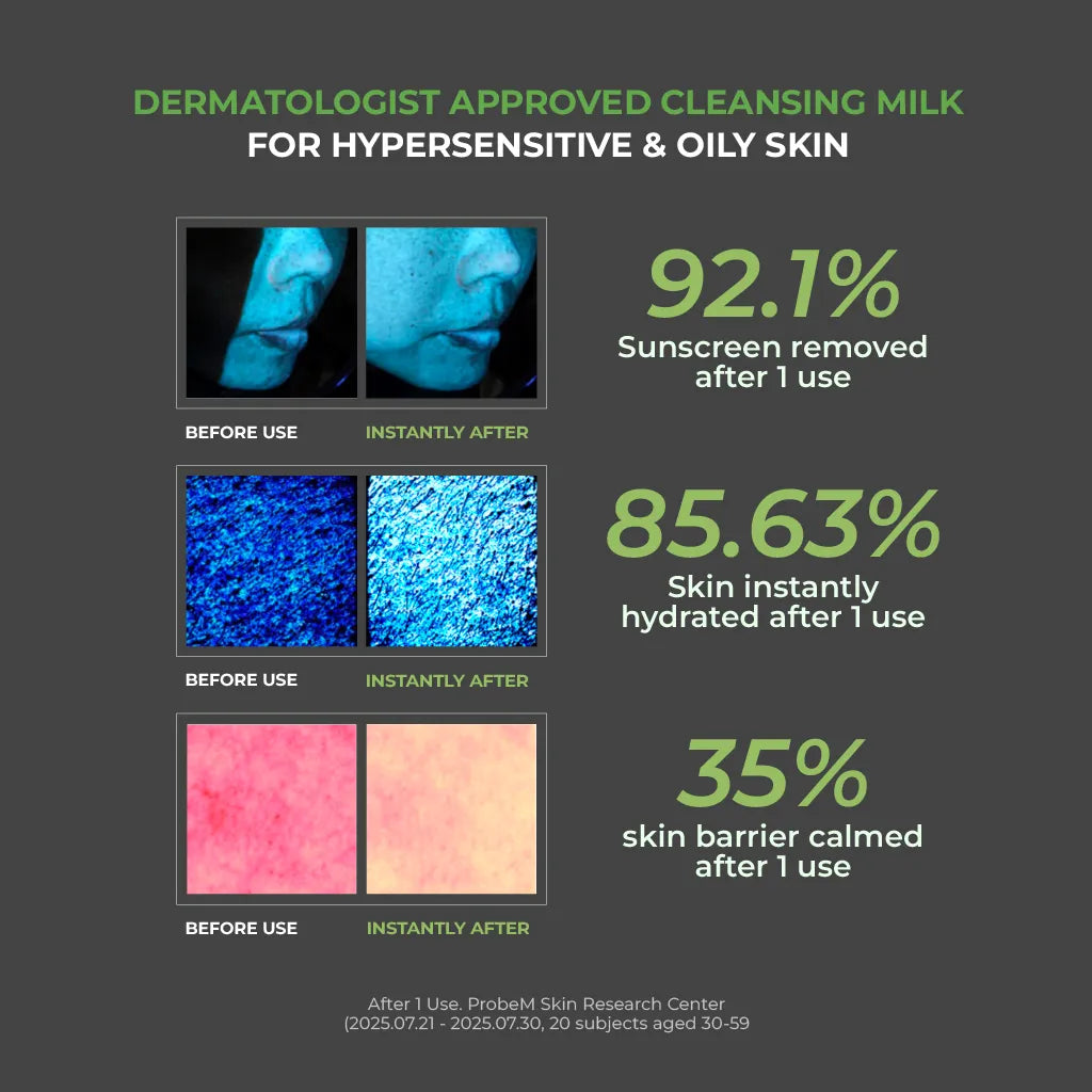 1. Dispense a suitable amount onto dry hands and gently massage over the face in circular motions to dissolve sunscreen and makeup.