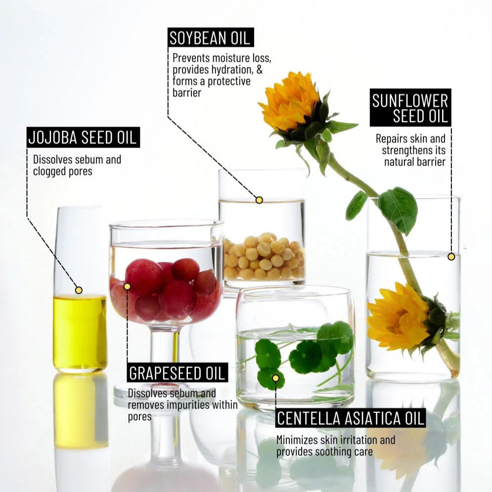 • Its 5 natural plant-based oils, including Soybean, Sunflower Seed, Jojoba Seed, Grapeseed, and Centella Asiatica, preserve moisture, dissolve skin impurities, and strengthen the skin's natural barrier.