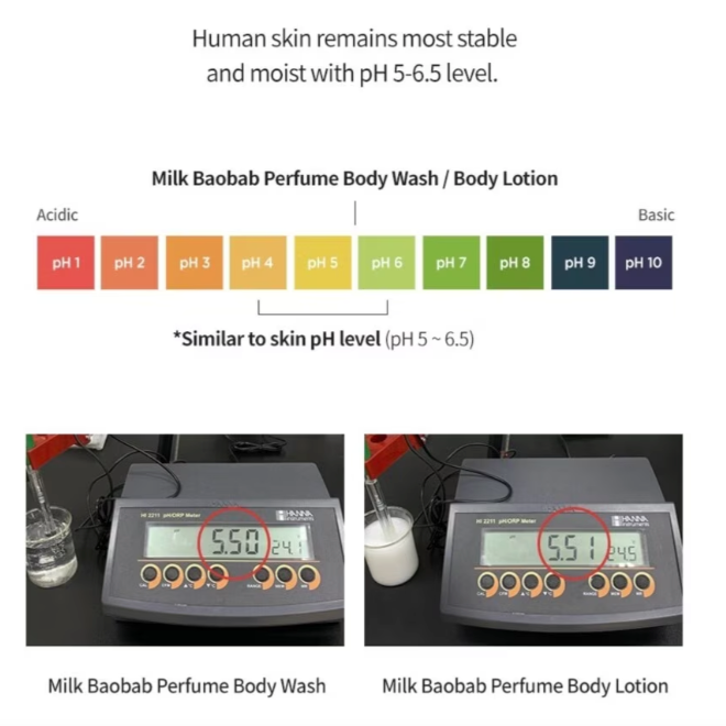 Wanna go for a ride to childhood? Try this sweet, powdery, long-lasting baby powder fragrance with notes from orange peel, iris, magnolia, sandalwood, vanilla, and ambergris. It can bring you back to good old memories of your childhood when the safest place on earth is your mothers arms, and you feel clean, soft, calm, and carefree. 6 fold Hyaluronic Acid (HA) in Milk Baobab Perfume Body Wash Baby Powder is the hydrating superpower for skin, it maximizes hydration, preventing skin from dryness even after washing. 6 types of honey extracts with various vitamins, amino acids and natural moisturizing factors make skin glowy, dewy and moisturized. Aqua 4 oil (olive, macadamia, jojoba, grapeseed) improves skin barrier. pH balanced formula helps maintain the skins health and stability by keeping the pH level at 5-6.5.