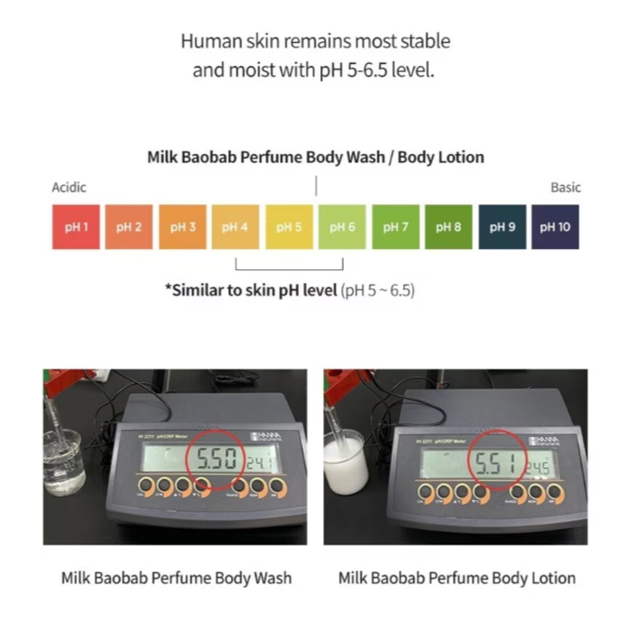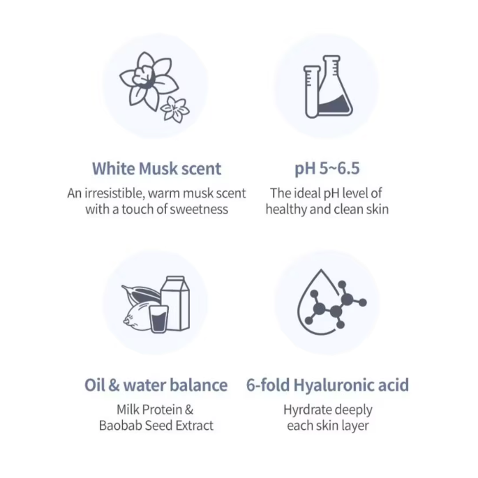Bright up your day with Milk Baobab's signature - the refreshing White Musk with notes from jasmine, rose, and ylang-ylang, touched by creamy vanilla. It evokes the fresh, clean, simple youth and also the fascination that can forever stay in your memory. 6-fold Hyaluronic Acid (HA) in Milk Baobab Perfume Body Wash White Musk is the hydrating superpower for skin, it maximizes hydration, preventing skin from dryness even after washing. Naturally derived surfactant from Soapwort leaf gently cleanses without causing irritation. Betaine extracted from sugar beet root is an NMF that helps control the oil-water balance in the skin, keep moisture, and prevent the loss of water in the skin. Panthenol acts as a moisture magnet, it holds and binds water in the skin, and also moisturizes, soothes, and protects the skin from stresses. pH-balanced formula helps maintain the skin's health and stability by keeping the pH level at 5-6.5.