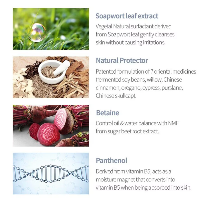 Water, Sodium Laureth Sulfate, Ammonium Lauryl Sulfate, Cocamide Methyl MEA, Fragrance, Sodium Chloride, Cocamidopropyl Betaine, Butylene Glycol, Origanum Vulgare Leaf Extract, Salix Alba (Willow) Bark Extract, Chamaecyparis Obtusa Leaf Extract, Portulaca Oleracea Extract, Cinnamomum Cassia Bark Extract, Scutellaria Baicalensis Root Extract, Lactobacillus/Soybean Ferment Extract, Saponaria Officinalis Leaf Extract, Glycerin, Milk Protein Extract(2,000ppm), Adansonia Digitata Seed Extract(2,000ppm), 1,2-Hexanediol, Sodium Hyaluronate, Sodium Hyaluronate Crosspolymer, Hydrolyzed Hyaluronic Acid, Hyaluronic Acid, Hydrolyzed Sodium Hyaluronate, Polysorbate 20, Niacinamide, Betaine, Sodium Benzoate, Panthenol, Citric Acid, Sodium Citrate, Disodium EDTA, Alpha-Isomethyl Ionone, Benzyl Benzoate, Benzyl Salicylate, Coumarin, Geraniol, Linalool
