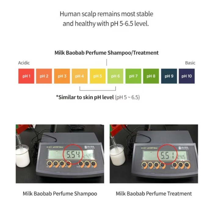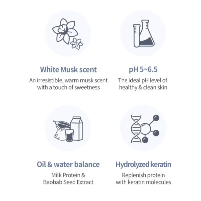 Bright up your day with Milk Baobab's signature - the refreshing White Musk with notes from jasmine, rose, and ylang-ylang, touched by creamy vanilla. It evokes the fresh, clean, simple youth and also the fascination that can forever stay in your memory. Hydrolyzed Keratin in Milk Baobab Perfume Shampoo White Musk infiltrates into the damaged cuticle layer, replaces the lost protein, and restores the hair's volume and radiant appearance. Coconut-derived surfactant and brand's patented formulation Botaniceutical Plus-10 help cleanse dirt and buildup without causing irritation to the scalp. Herb complex extract from Rosemary, Peppermint, and Chamomile provides moisture and nutrition for hair. The Black Trio (black beans, black sesame, black rice) helps nourish and strengthen damaged hair with power from nature. pH-balanced formula helps maintain the scalp's health and stability by keeping the pH level at 5-6.5.