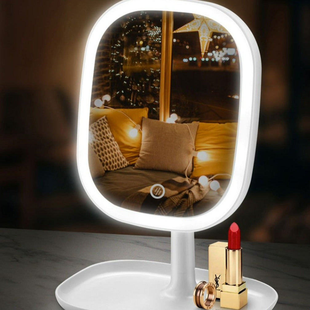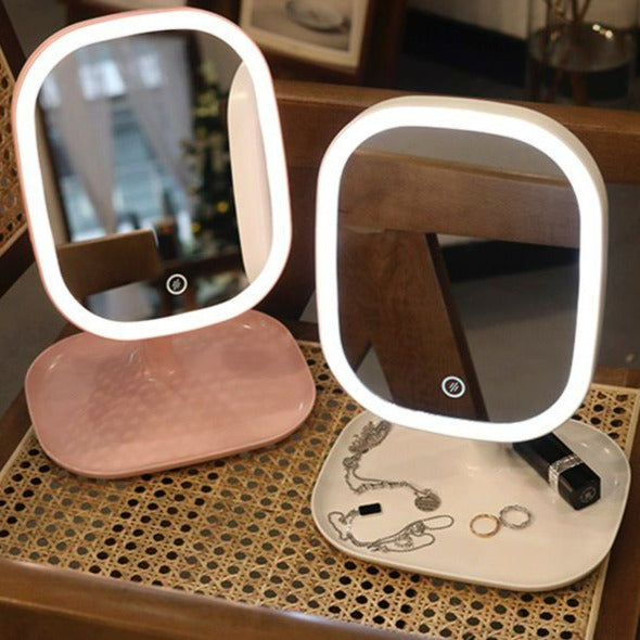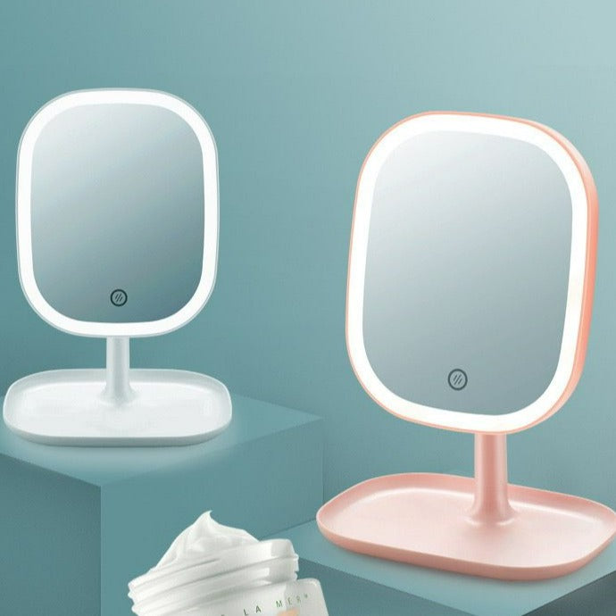 Mini table standing mirror with LED touch light, Only in 2 colours. Pink & White.