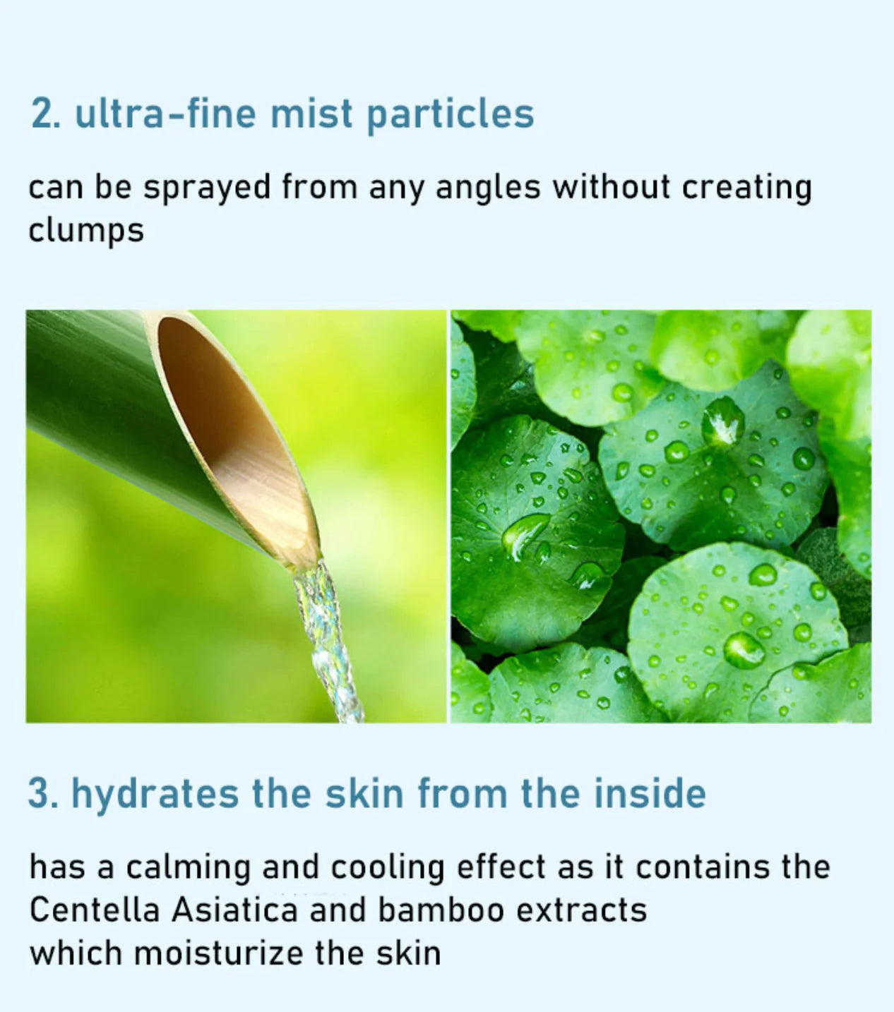 Spray onto face from about 20-30cm away before and after makeup application. Wait about 30 seconds - 1 minute so a protective layer can form. Make sure to clean the nozzle after usage. When you feel that the mist is weak or not spreading evenly, remove the nozzle and clean it with warm water.