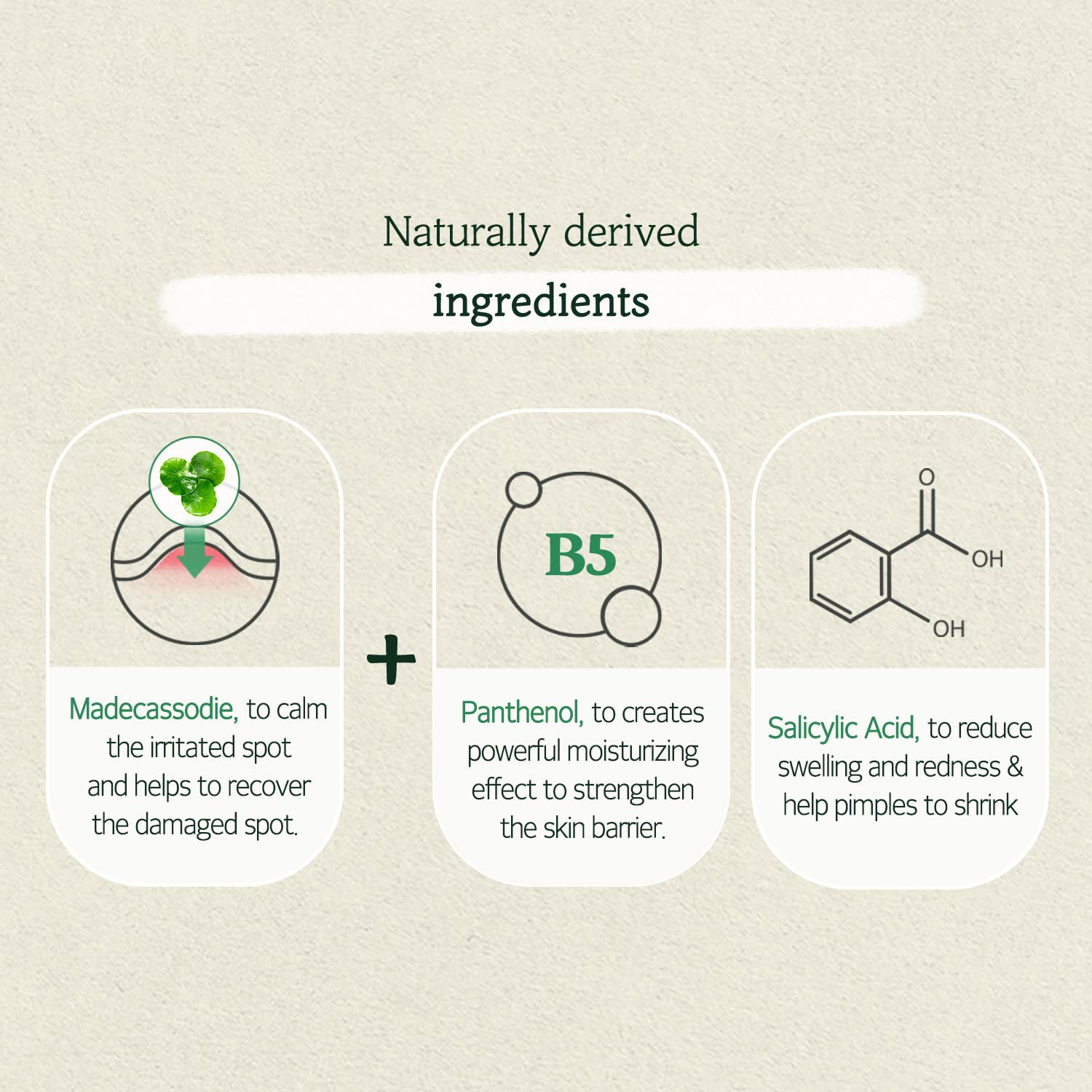 • Infused with Madecassoside, Panthenol and Salicylic Acid to treat troubled skin and promote healing.