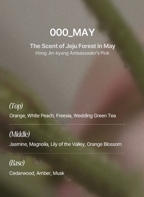 • #000 MAY - It begins with the sweet notes of orange and white peach, accompanied by fresh freesia. As the fragrance develops, jasmine and magnolia blend with the subtle scent of lily of the valley and orange blossom. The warm finish unfolds with soft hints of cedarwood, amber, and musk.
