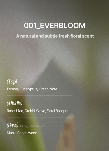 • #001 EVERBLOOM - It opens with a refreshing blend of lemon, eucalyptus, and fresh green notes, followed by a floral bouquet of rich rose, lilac, orchid, and subtle clove. The fragrance finishes with the soft, warm lingering notes of musk and sandalwood.