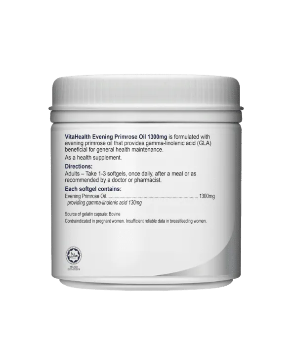 VitaHealth Evening Primrose Oil 1300mg is formulated with evening primrose oil (EPO), providing a natural source of gamma-linolenic acid (GLA).