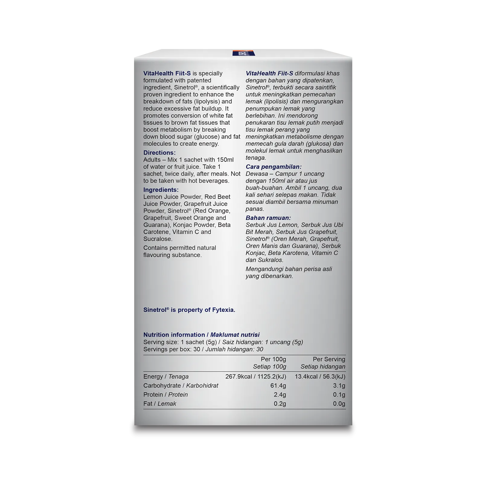 VitaHealth Fiit-S features Sinetrol®, a proprietary Mediterranean weight-loss ingredient with clinically proven efficacy on reduction of body weight, body fat, waist and hip lines.