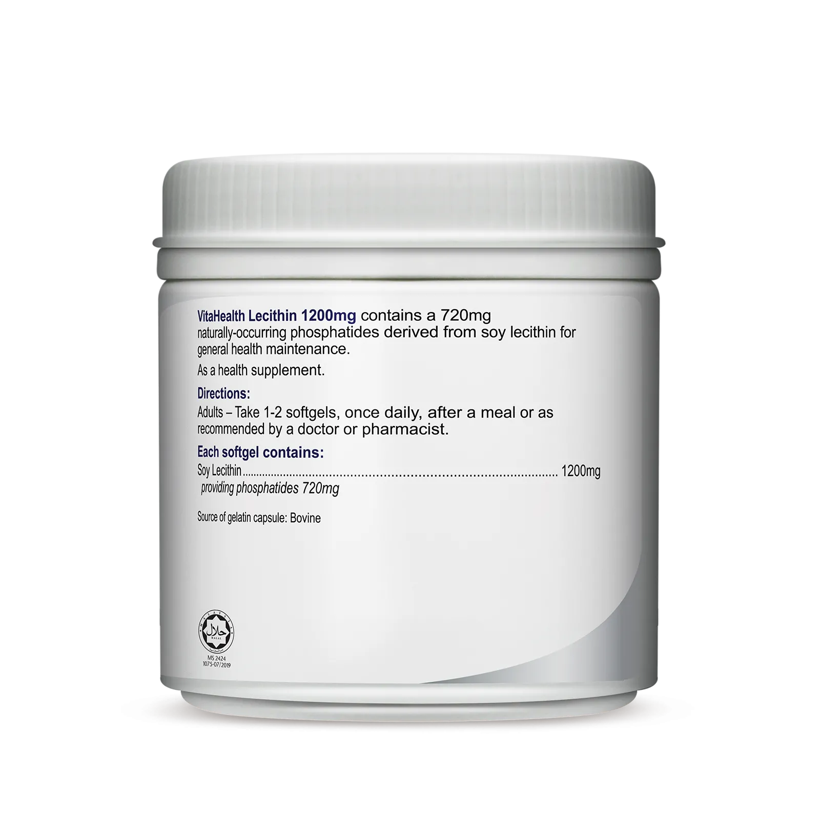 VitaHealth Lecithin 1200mg provides 720mg of naturally occurring phosphatides for general health maintenance.