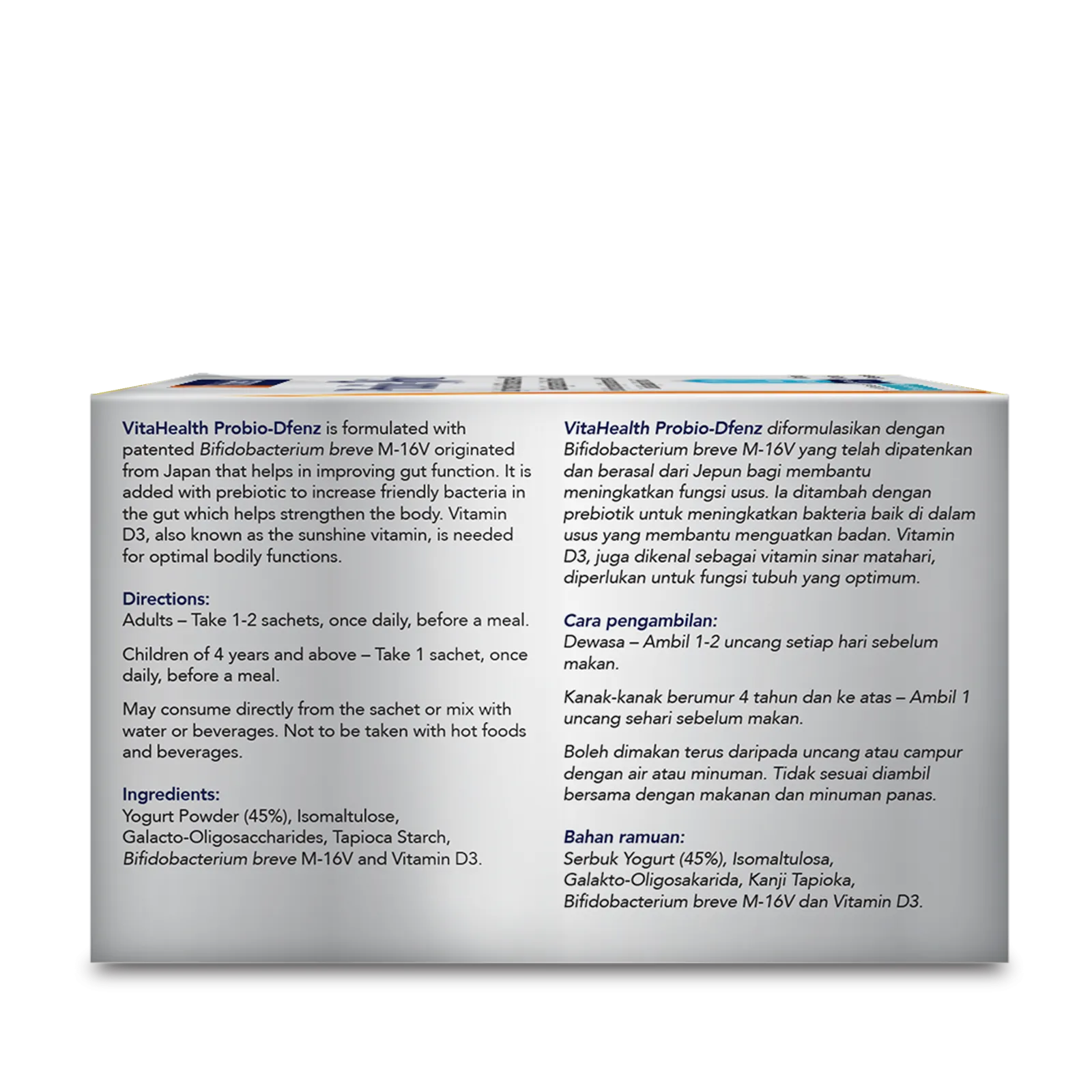 VitaHealth Probio-Dfenz features effective dosing (2 billion CFU) of probiotic Bifidobacterium breve M-16V, galacto-oligosaccharides (GOS) and vitamin D3 in convenient sachets.