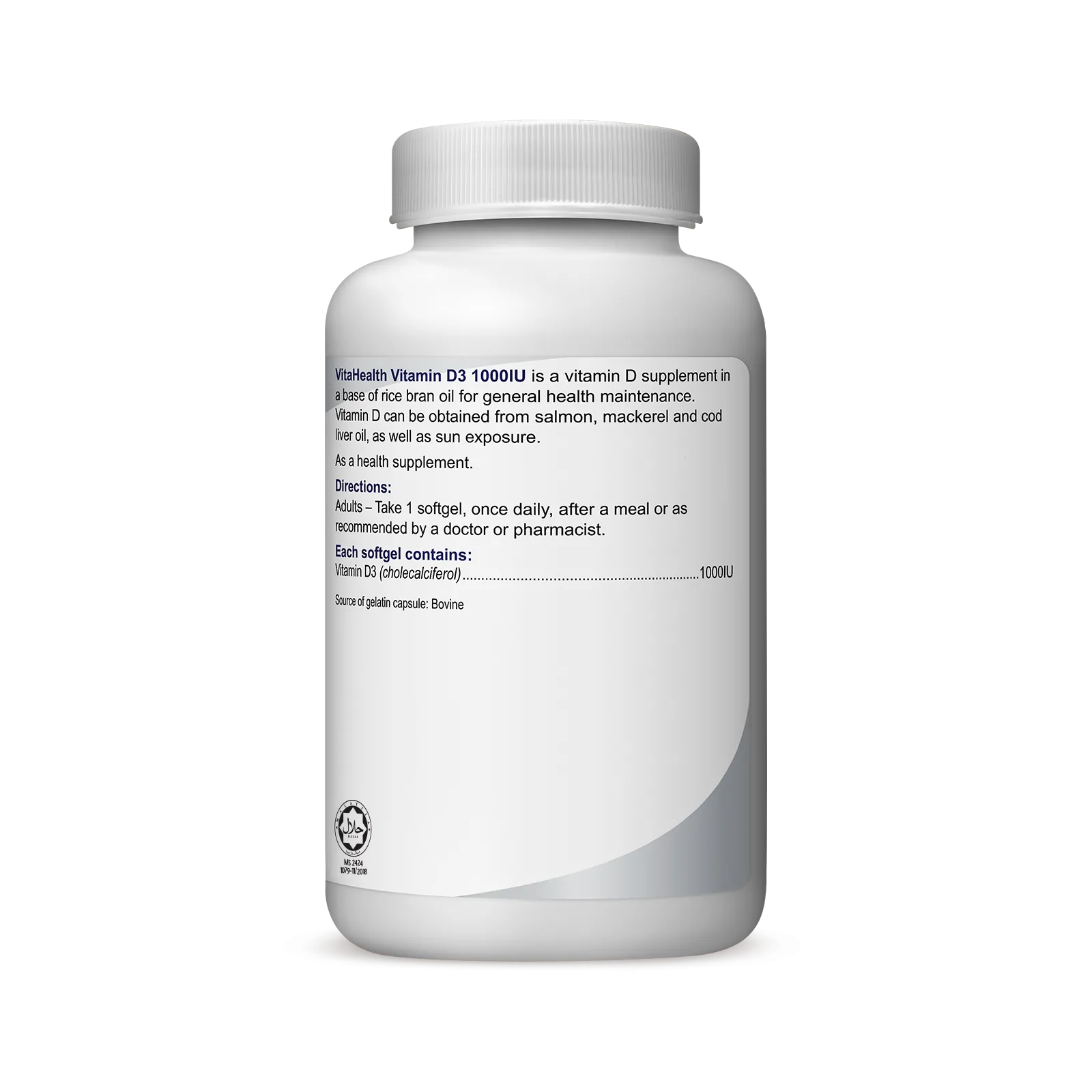 VitaHealth Vitamin D3 1000IU is formulated with vitamin D3 (cholecalciferol) for supporting body health.
