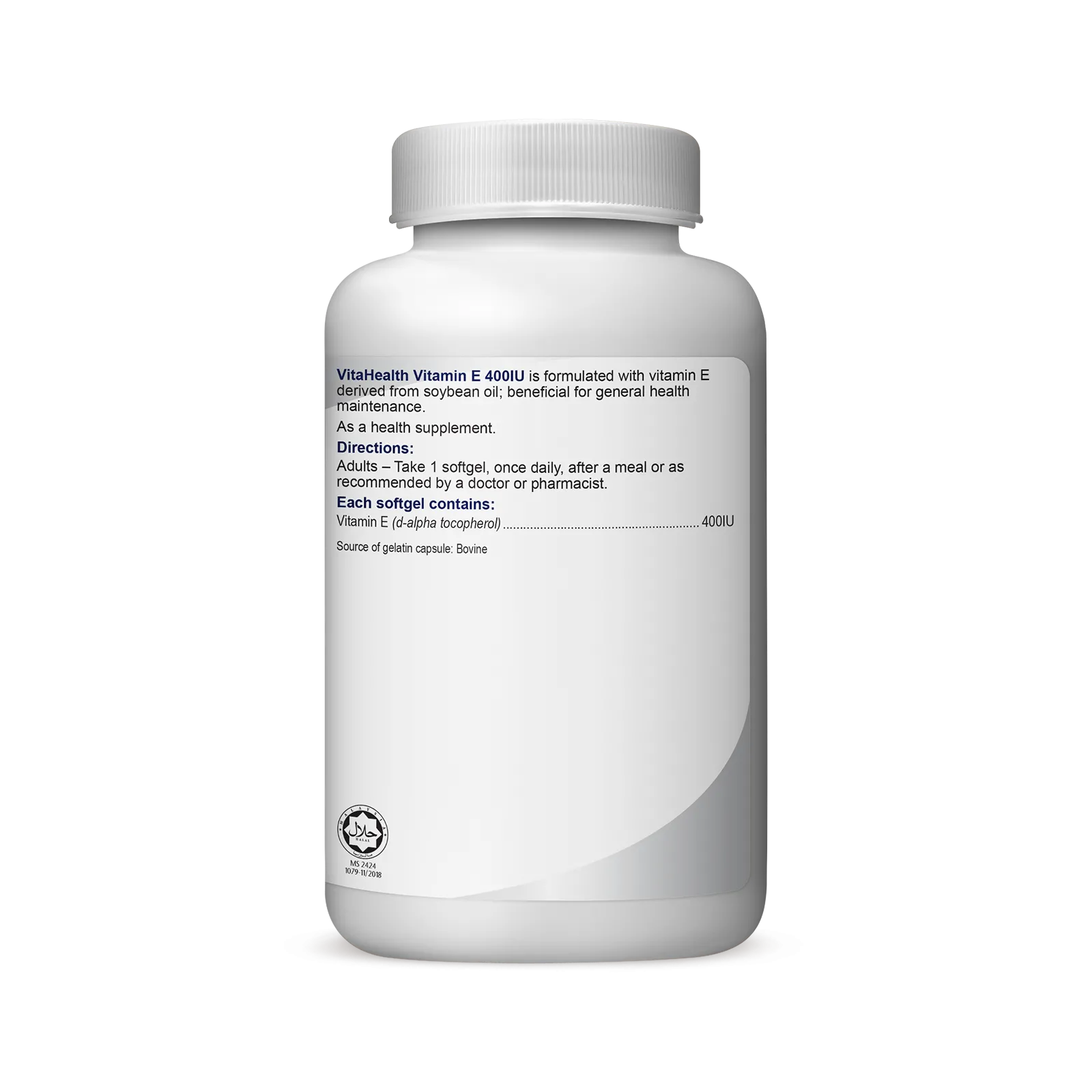 VitaHealth Vitamin E 400IU provides a natural source of vitamin E (d-alpha tocopherol) derived from soybean oil.